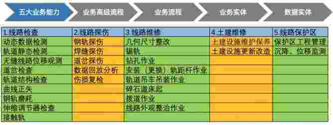 在轨道运维业务中,,,,,,,,,,,我们形成了完整的从业务能力(业务域)-业务流程-业务实体-数据模型的分析梳理过程。。。。。。。。。。。。轨道运维业务能力如下图所示::::::::::::::